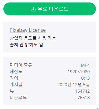 픽사베이에서 무료로 내려받기 원하는 영상을 클릭하시면 우측 하단에 위 사진과 같은 라이선스 정책이 안내됩니다. 상업적 용도로 사용 가능한지, 출처를 밝여야 되는지 직관적으로 알 수 있게 되어 있습니다.
