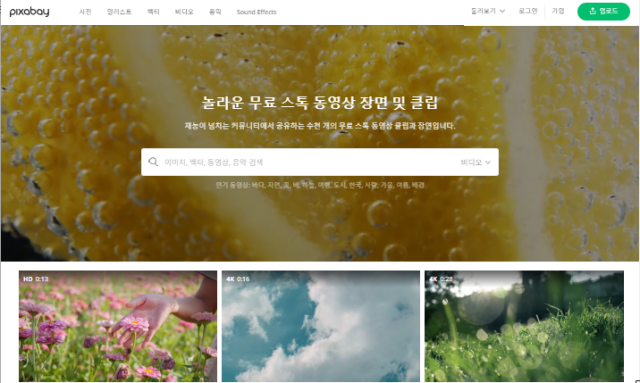 가장 인지도가 높고 동영상 숫자가 많은 사이트는 픽사베이 입니다. 무료 동영상 공유사이트 중에서 가장 높은 점유율을 차지 하고 있으며, HD급 및 4K 고화질 동영상을 무료로 다운로드 받을 수 있습니다.