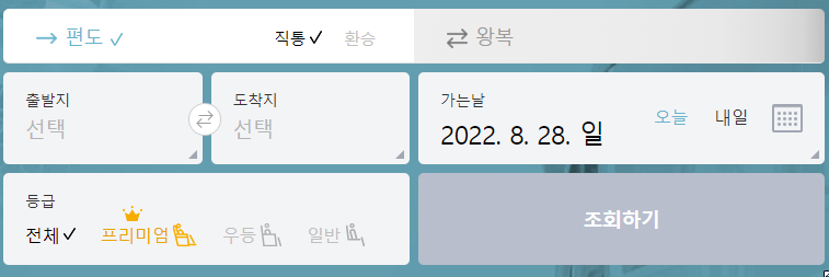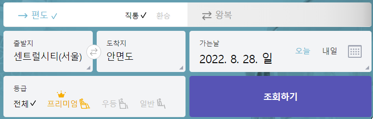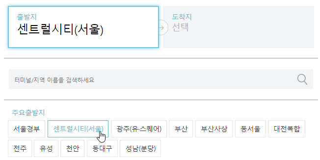 메인화면에 위 그림과 같은 출발지와 도착지를 선택하는 화면이 나오면 출발지를 센트럴시티터미널로 선택하여 줍니다.