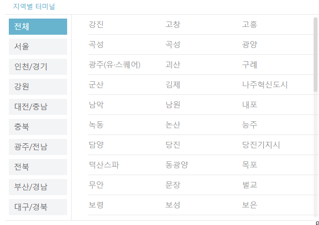 그 후 도착지를 선택하면 되는데, 서울, 인천/경기, 강원, 대전/충남, 충북, 광주/전남, 전북, 부산/경남, 대구/경북 등으로 지역을 선택하면 해당 지역에 있는 버스 터미널 리스트가 나오게 됩니다.