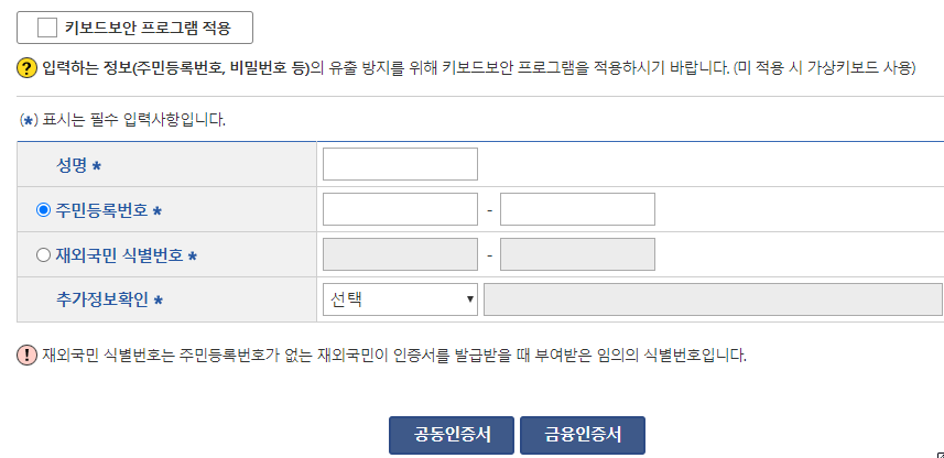이제 본인의 이름, 주민등록번호, 추가 정보 확인(부모님 이름 등) 등 총 세 가지 정보를 입력한 후 공동 인증서나 금융인증서 암호를 입력한 후 로그인합니다. 참고로 본인(나)의 인증서로 부모님 가족관계증명서 발급이 가능합니다.