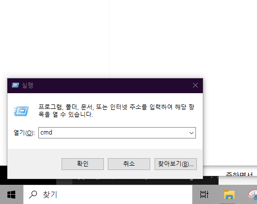 1. 윈도우 + R 키를 눌러 실행창을 연고 'cmd' 를 타이핑후 엔터, 또는 윈도우 10의 경우 찾기 창에 cmd를 입력한다.