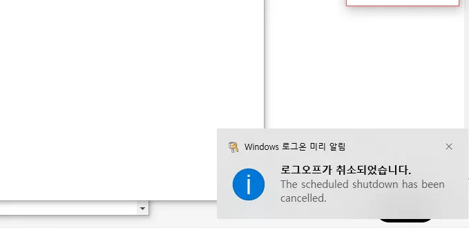 예약시간을 잘못 입력했거나 자동종료를 취소하고 싶을때는 shutdown -a 명령어를 사용하시면 됩니다. -a 옵션의 abort 의 의미입니다. 정상적으로 취소가 실행되면 윈도우 화면 오른쪽 하단에 아래 그림과 같이 로그오프가 취소되었다고 알려 줍니다.