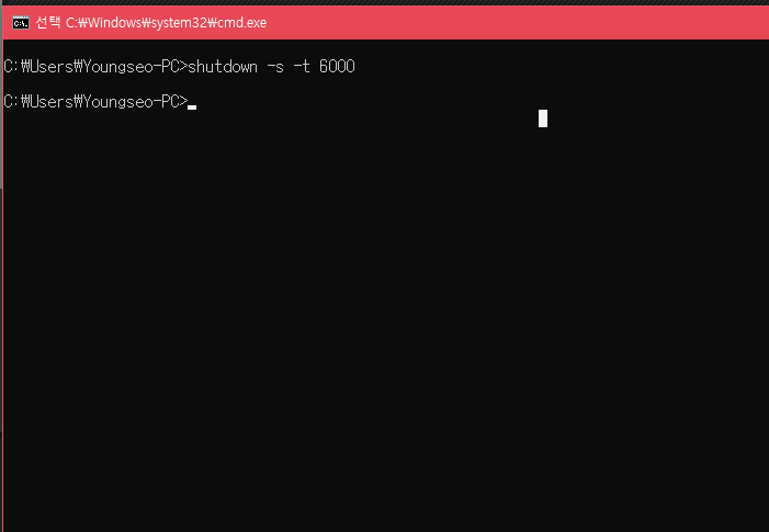 2. 아래 사진처럼 까만 색의 cmd 프롬프트 창이 나오면 명령어를 [ shutdown -s -t 시간 ] 문법으로 타이핑 후 실행한다. 시간단위는 초단위 임으로 내가 10분후에 컴퓨터를 끄고 싶다면 60초는 1분 이니 600초를 입력하면 10분후에 꺼진다.