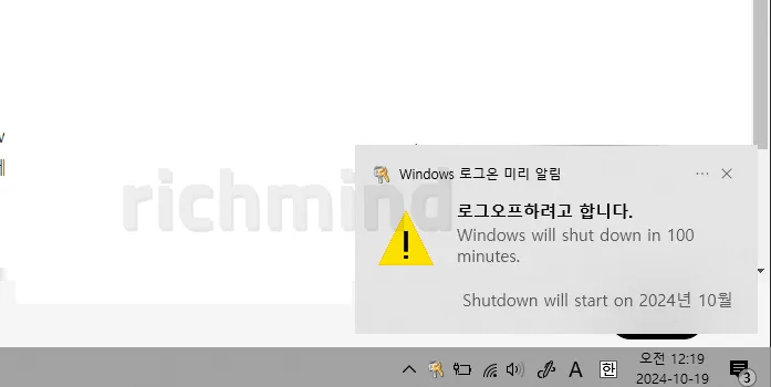 정상적으로 명령어가 실행됐다면 아래 사진처럼 윈도우 알림 창이 뜨면서 몇분 후에 윈도우가 종료 될지 알려줍니다. 저는 6000초로 설정했기 때문에 100분후에 로그오프 된다고 알려주고 있습니다.
