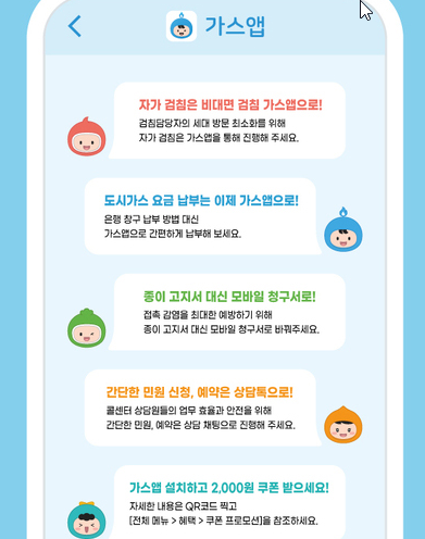 - Q: 요금 납부는 어떻게 하나요? A: 요금 납부는 은행, 인터넷 뱅킹, 또는 고객센터를 통해 가능합니다. 카드 결제도 지원합니다. 지금은 모바일 가스앱으로도 자가 검침, 요금 납부, 모바일 청구서도 가능합니다. 현재 가스앱을 설치하면 2천원 쿠폰도 주는 이벤트를 하고 있습니다.