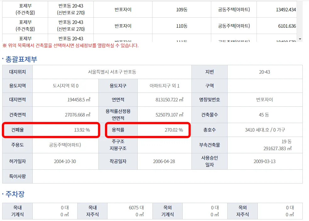 - 반포자이의 건폐율과 용적률 예시
