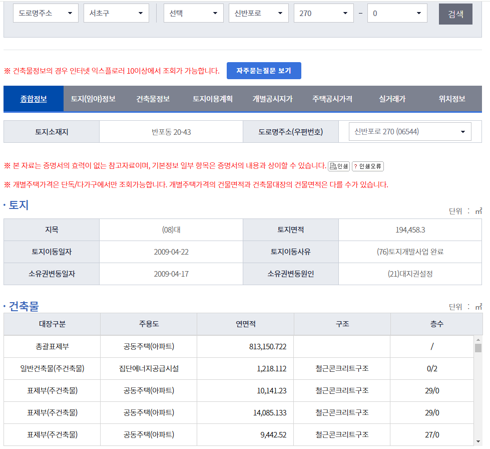 건축물 정보 탭을 선택하면 아래 사진과 같이 총괄표제부가 출력되는데요. 여기에 건폐율 13.92% 와 용적률 270.02%, 주용도, 대지면적. 연면적, 건축면적, 용적률산정용 연면적 등 자세한 정보를 볼 수 있습니다.