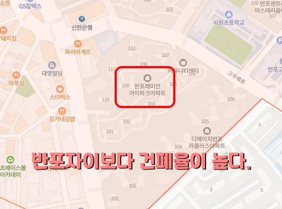 - 좀 더 남쪽으로 반포래미안아이파크 아파트가 있는데 여긴 용적률 285%이고, 건폐율이 17%입니다. 최고층이 34층입니다. 이렇게 예를 들어보니 반포자이에 비해 반포래미안 아파트가 더 촘촘하게 건물을 짓고 층수도 높다는 걸 확인할 수 있죠.