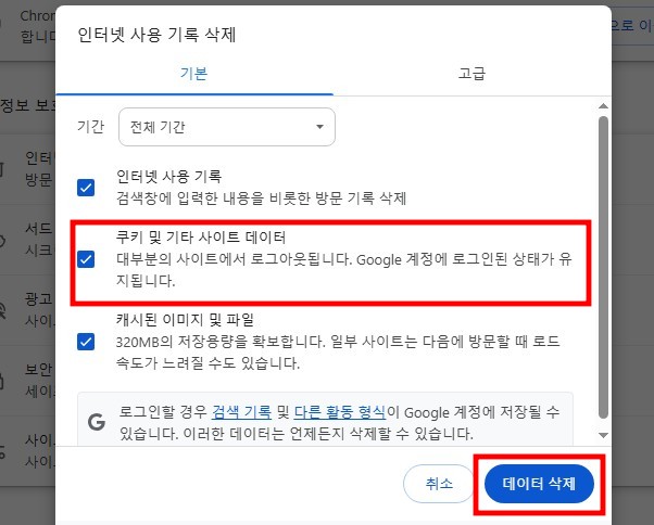 5. 쿠키 및 기타 사이트 데이터와 캐시된 이미지 및 파일을 선택한 후 데이터 삭제를 누릅니다.