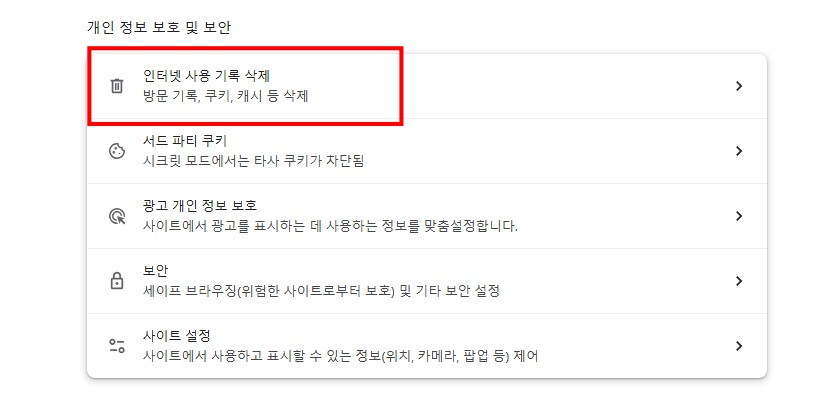 4. 인터넷 사용 기록 삭제를 클릭합니다.