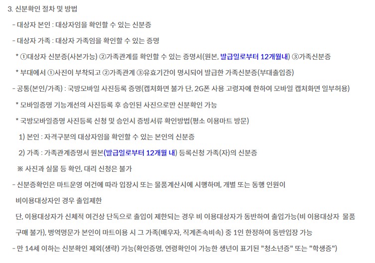 군마트 입장 시 반드시 본인 확인 절차를 거쳐야 합니다. 대상자 본인과 가족의 확인 방법은 다음과 같습니다.